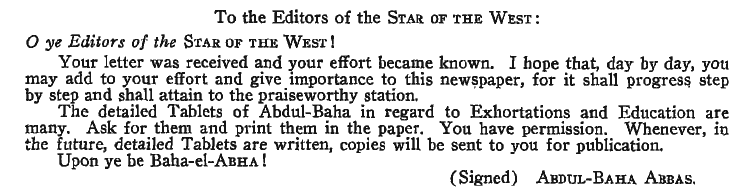 The Star of the West was a Bahá'í periodical which began publication on March 21, 1910 and ended publication under this title in March 1935. The periodical featured translations of some Tablets of 'Abdu'l-Bahá and writings from Shoghi Effendi along with sharing news of the Bahá'í world. The text was mostly in English, but also often offered a Persian language section with its own content. From Wikipedia, the free encyclopedia